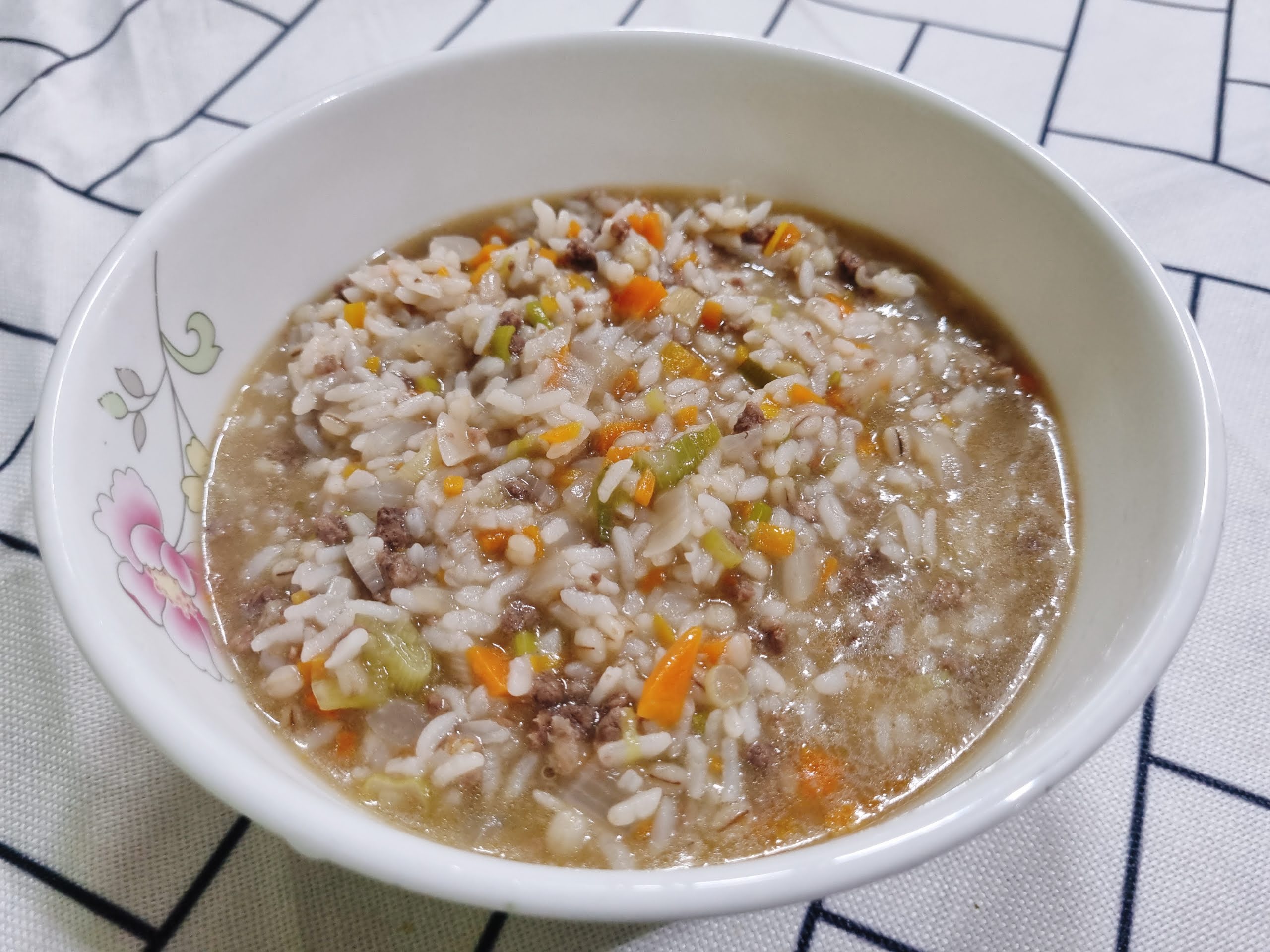몸이 아플 때 음식으로 쇠고기 야채죽을 만들려면 쌀을 먼저 불려야 합니다. 뜨거운 물에 아주 빨리 불립니다. 배가 너무 고파요. 조금만 주세요.