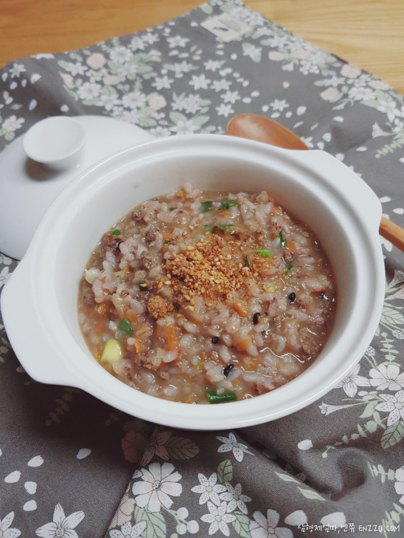 너무 먹음직스럽죠?? 고소함을 더하기 위해 통깨를 조금 뿌렸습니다. 소고기야채죽 레시피입니다. 한번 해보세요.