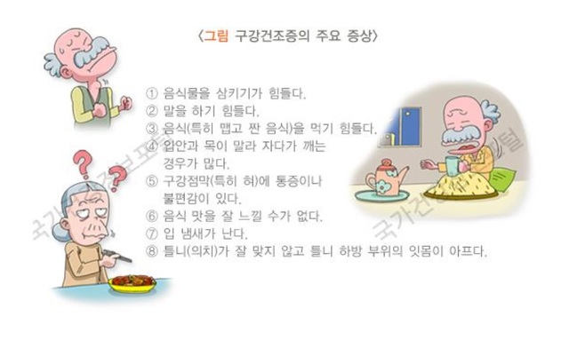 구강건조증은 이런 기능을 하는 침의 분비가 줄어들면서 입안이 건조해지는 현상을 의미합니다. 60세 이상일 때부터 절반 정도가 이것을 경험하고 있는 것으로 알려져 있는데, 주로 남성보다 여성에게서 많이 발생하며, 연령층이 증가할수록 발병률이 높아집니다. 구갈의 원인