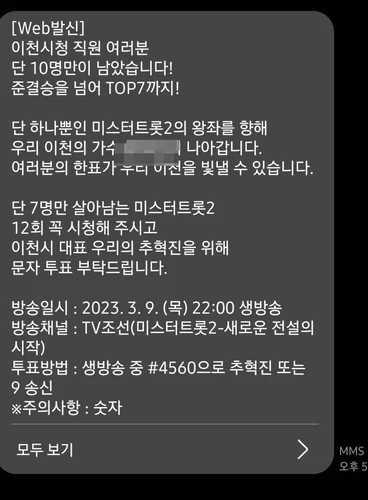 이천시가 공개 문자 메시지를 통해 트로트 대회에 참가한 이천시 참가자들에게 투표를 독려하는 황당한 사태가 벌어졌다. 나는 이것이 진짜인지 누군가가 농담을 하는 것인지 잠시 생각해야 했다. 그러나 논란이 일자 이천시는 사과했고 이는 모두 사실로 밝혀졌다.
