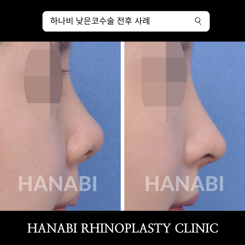 위 사진은 하나비 코재건 수술 사례입니다. 자가늑연골을 이용한 교정. 짧아진 코끝이 길어지면서 코의 모양과 함께 얼굴의 균형이 회복되는 것을 볼 수 있습니다. 늑연골이 굳어 늑연골 채취가 어려우시거나 늑연골 사용에 부담을 느끼시는 경우 코끝에는 기증연골을, 콧등에는 기증진피를 사용할 수 있습니다.