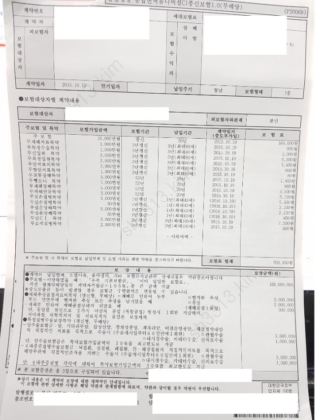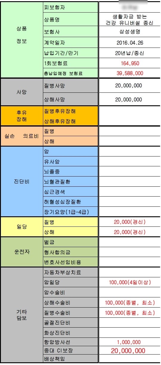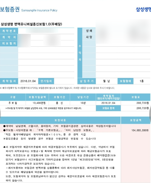 ※ 사망보험금은 100만원입니다. 월 보험료는 200,720원이고 보험료 총액은 24,086,400원입니다. 다시 알 필요가 있는 것은 피보험자가 신청 당시 22세 여성 → 현재 28세 여성이라는 것입니다.