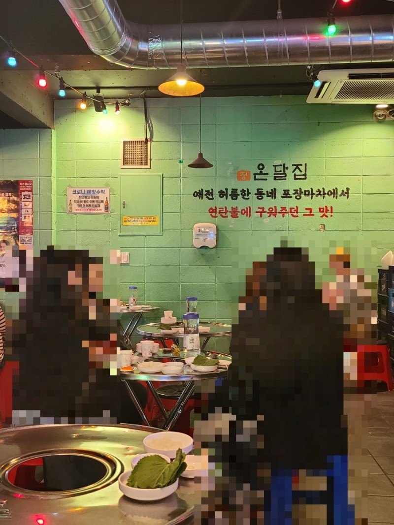 외부(간판) 사진을 깜빡했네요. 사람이 별로 없어서 가게 사진을 찍었습니다. 모든 테이블은 이렇게 원형+플라스틱 의자 조합입니다. 초라한 동네 노점에서 연탄불에 굽는 맛을 재현한다고 벽에 적혀 있는데… 정말…?