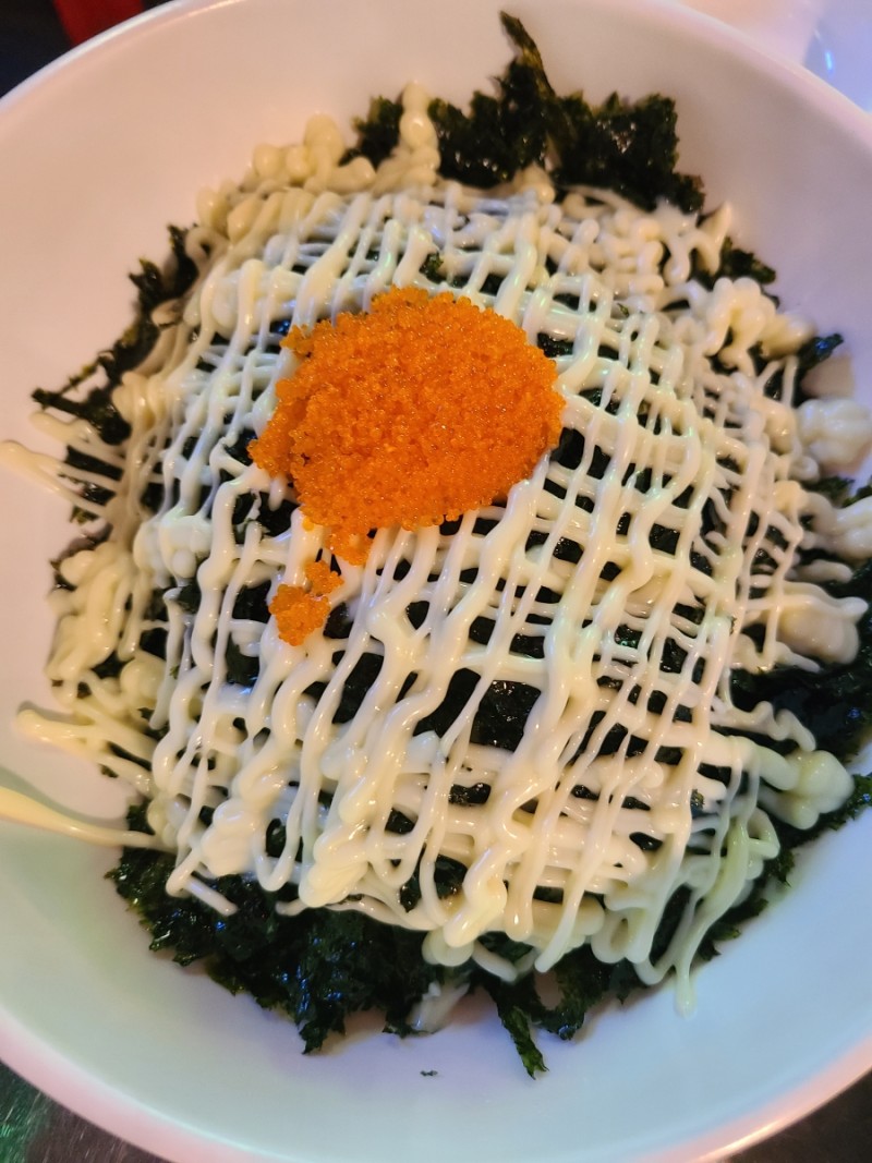 그리고 밥은 한국 식탁의 필수품이죠? 간장 마요밥인데 비벼서 닭다리살, 닭똥집, 순살닭발과 함께 드셔도 별미입니다. 깻잎에 싸서 야생으로 먹었습니다.