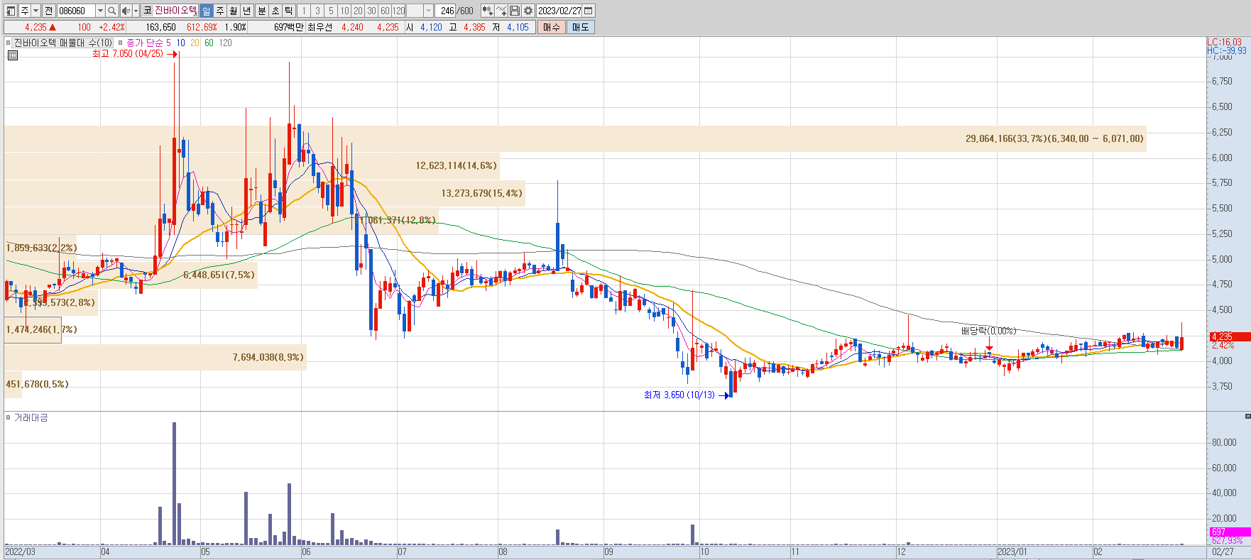 - 52주 고가: 7,050 / 저가: 3,650