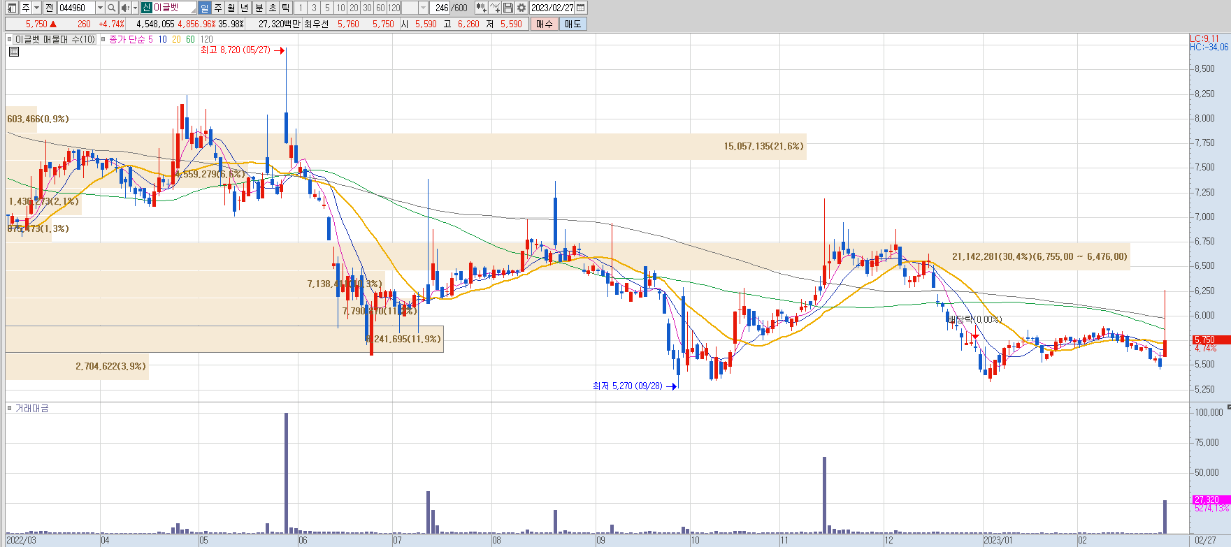 - 현재가: 5,750 / +260 / 전일대비 +4.74%
