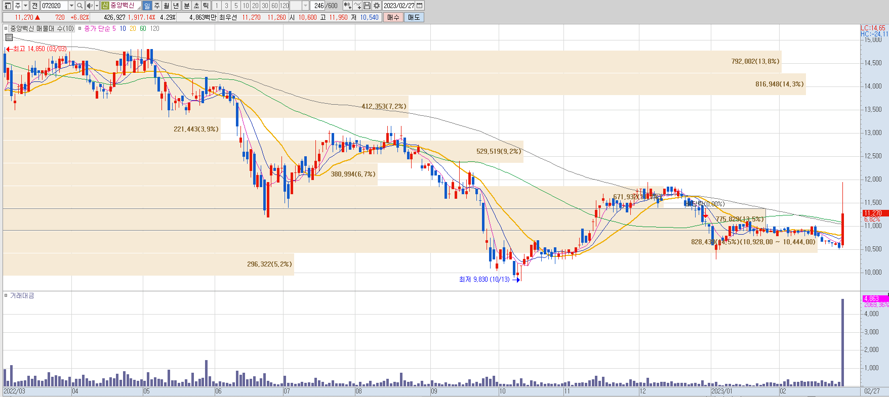 - 현재가: 11,270 / +720 / 전일 대비 +6.82%