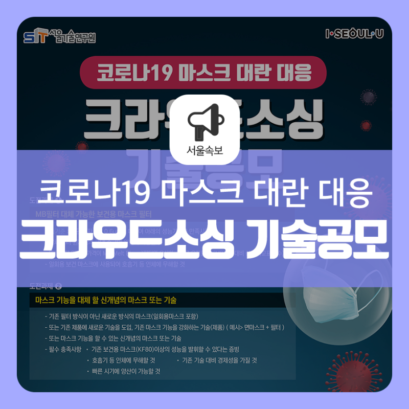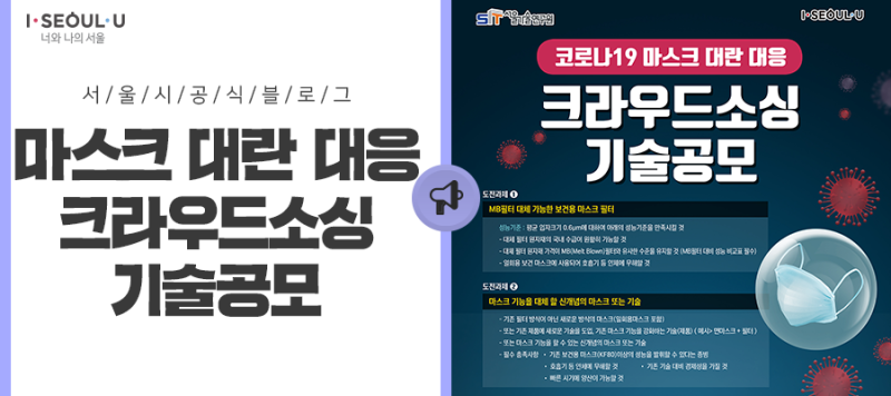 최근 코로나19 사태로 인한 마스크 위기를 해결하기 위해 국내외 시민의 기술제안을 통한 마스크 필터 및 대체기술 기술 경진대회를 개최하였습니다. 민간 기업을 포함하여 누구나 참여할 수 있습니다.
