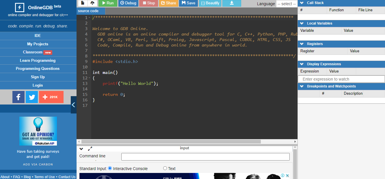 GDB 온라인 디버거 | 컴파일러 – 코드, 컴파일, 실행, 디버그 온라인 C, C++