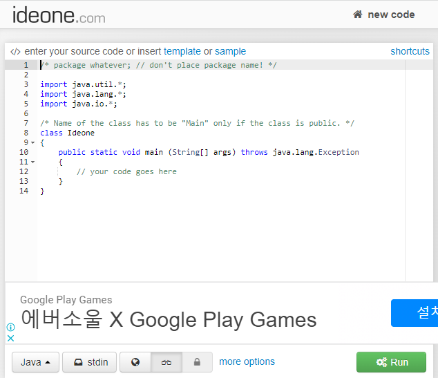 입력창을 이용하여 입력값을 입력할 수도 있고, 코드를 테스트하기에 좋은 사이트입니다.