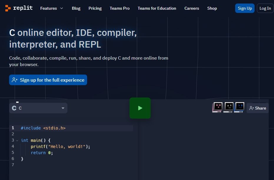 온라인 C 컴파일러 및 인터프리터로 C 코드를 작성하고 실행합니다. 브라우저에서 바로 애플리케이션을 구축, 공유 및 호스팅할 수 있습니다!