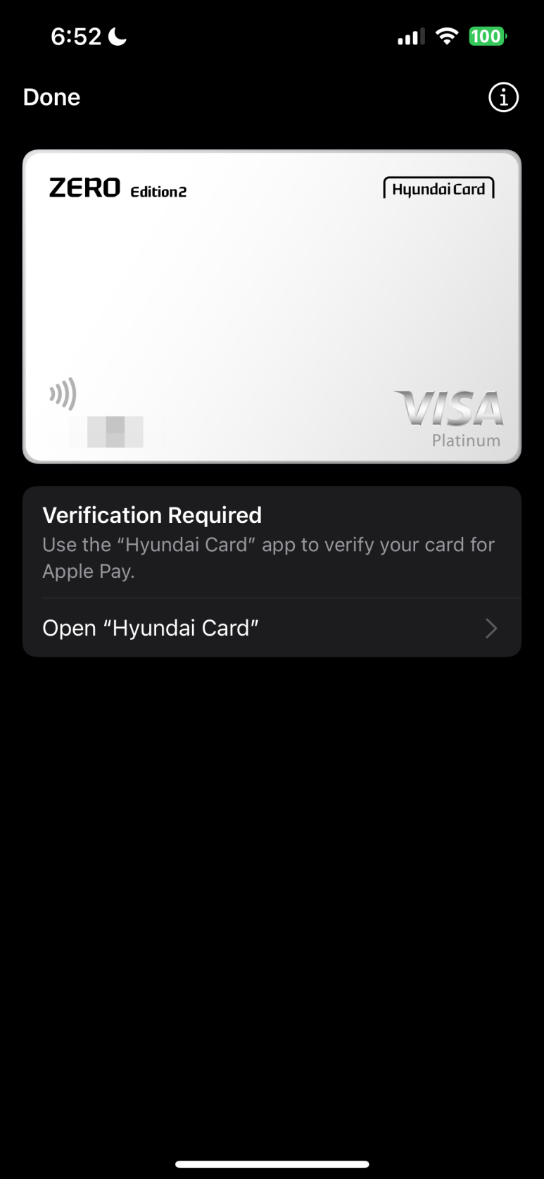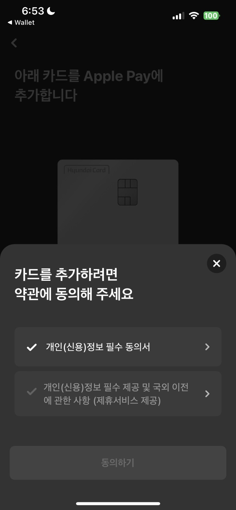 아이폰 지갑 앱을 활성화하고 현대카드 정보를 입력했습니다. 등록된 것을 확인하였습니다.